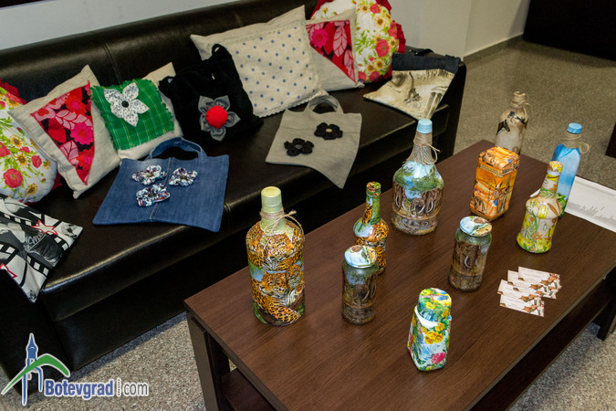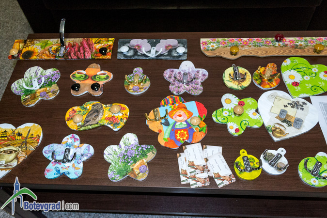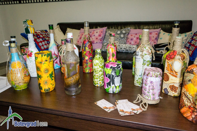 Тази вечер в „Салон на изкуствата 2016г.” към Исторически музей-Ботевград бе представена изложба-базар. на шишета декупаж, буркани и закачалки, украсени чрез прилагане на същата техника, различни видове цветя, възглавници, килимчета, шалове и всякакви възможи украшения за дома. Предметите са ръчно изработени от Даниела Цветанова и приятели.