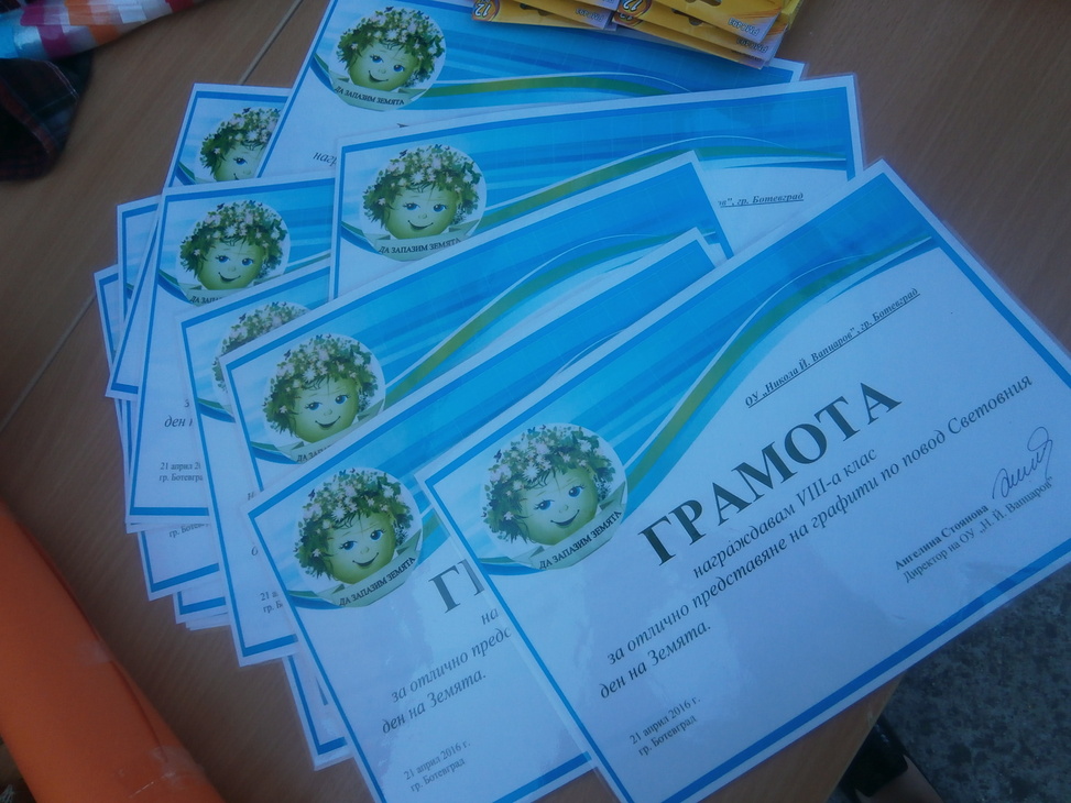 -колективна награда: VIII клас – графити; V „б” клас – табло; III „г” клас – табло; ПИГ I „а” и I „е” клас - рисунка;