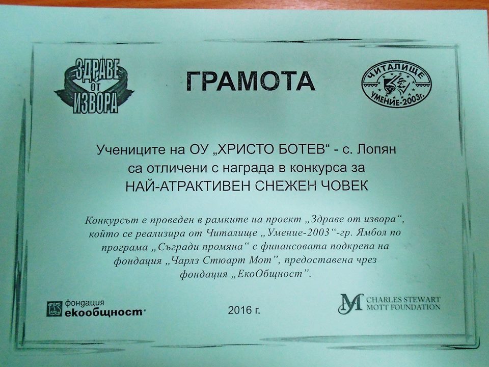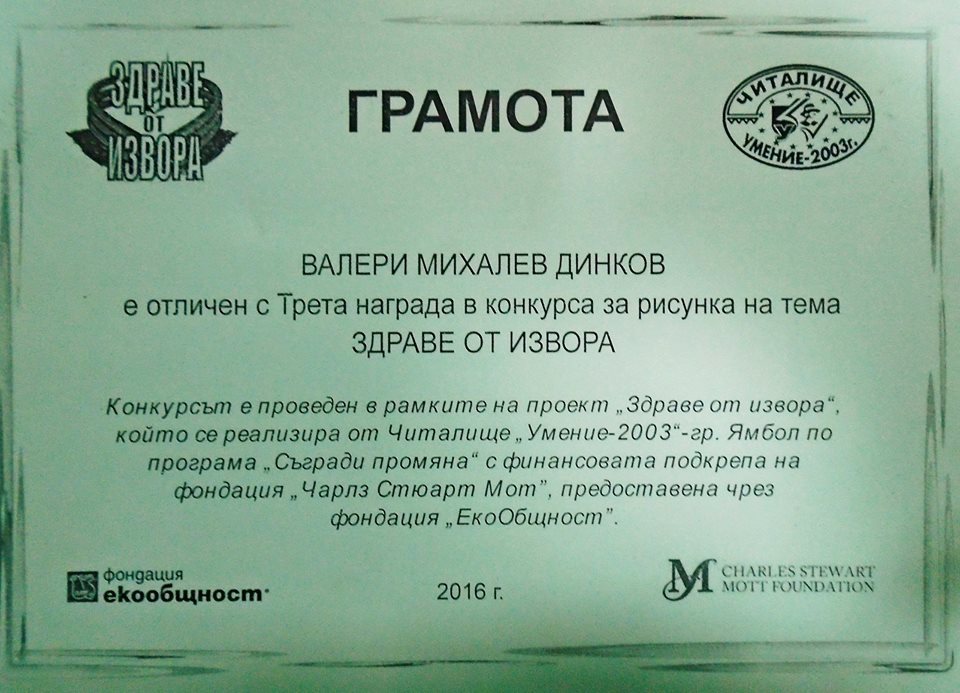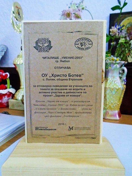 В края на представлението госпожа Фердинандова раздаде удостоверенията за завършен първи клас на най-малките възпитаници и връчи Почетен плакет и грамоти на третокласниците от Читалище „Умение“ за отговорно поведение по темата за опазване на водите и активно участие в дейностите по проект „Здраве от извора“.