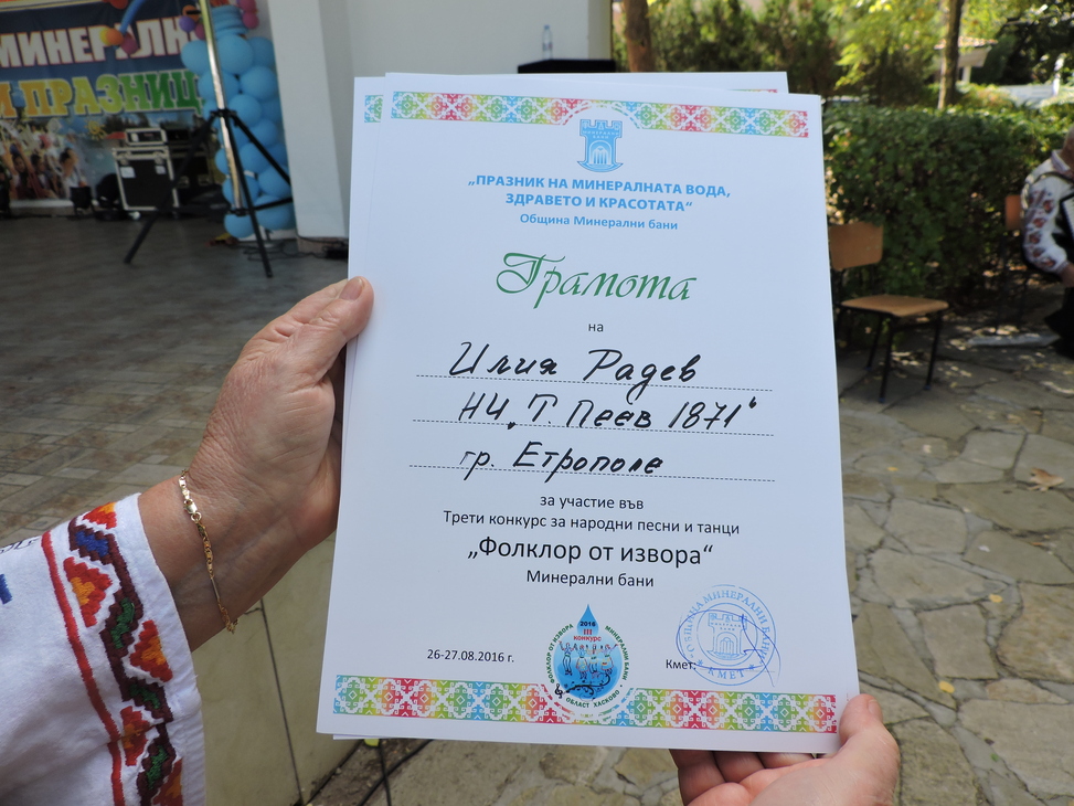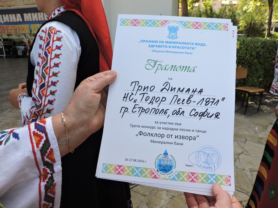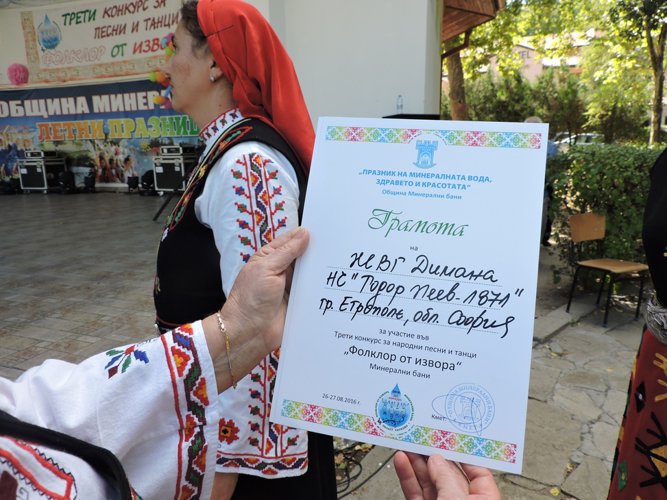 Такива емисари в сърцето на Тракия се оказаха изпълнителите от Женската вокална група „Димана” с ръководител Диляна Колева Гоцева. За трета поредна година бяха на сцената на Празника на минералната вода, здравето и красотата в с. Минерални бани, Хасковско.