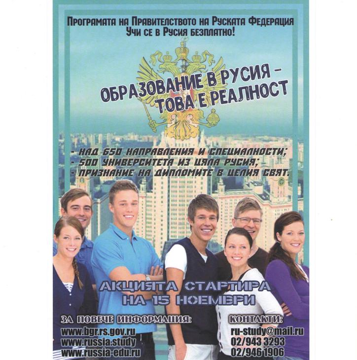 Ръководството на местната структура на Национално движение "Русофили" информира, че е обявен прием за безплатно обучение на български студенти в Русия. Обучението е безплатно, финансира се от Бюджета на РФ.