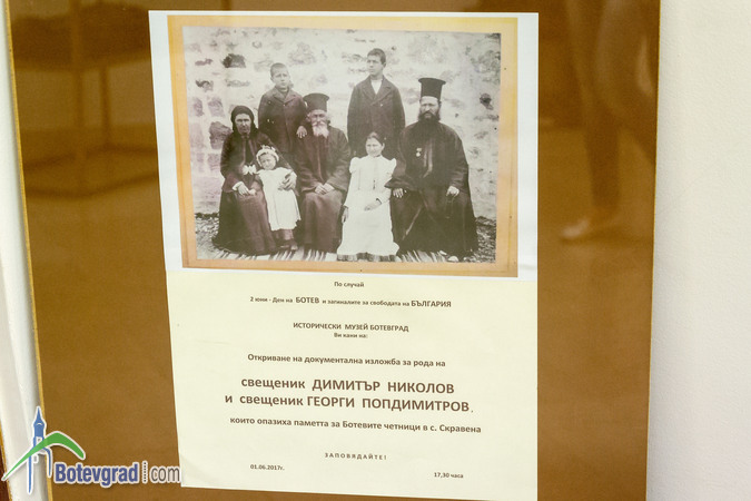 „Тази изложба е от родния дом на онзи свещеник в Скравена – Димитър Николов, който погреба тленните останки на десетте Ботеви четници, които днес се намират в паметника-костница в селото. Всичко, което изложбата съдържа, е предоставено специално за днешното честване от неговия потомък Димитър Попгеоргиев”, обясни при откриване на изложбата директорът на музея Тодорка Коцева. Тя определи като изключително ценен експонат епитрахила, с който свещеник Димитър Николов е погребал четниците.
