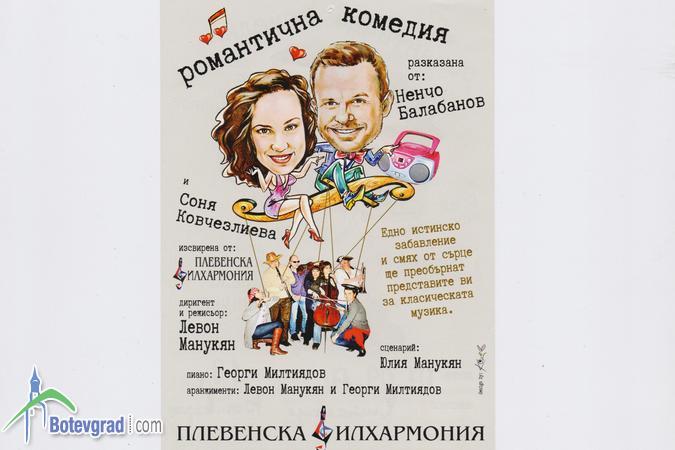 Едно истинско забавление и смях от сърце ще преобърнат представите Ви за класическата музика. „Романтична комедия“ разказва как двама влюбени търсят любимото си произведение в един компактдиск, превключвайки произволно плеъра. Така попадат на различни класически, етно и дископроизведения (изпълнени на живо от Плевенската филхармония), изпадайки в смешни и развлекателни ситуации.