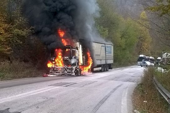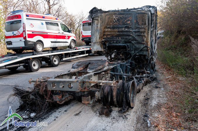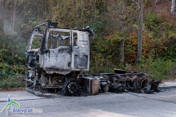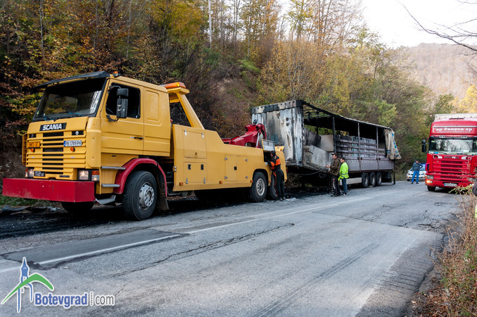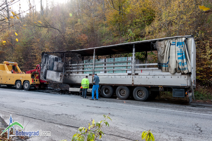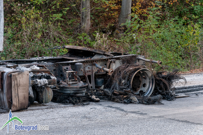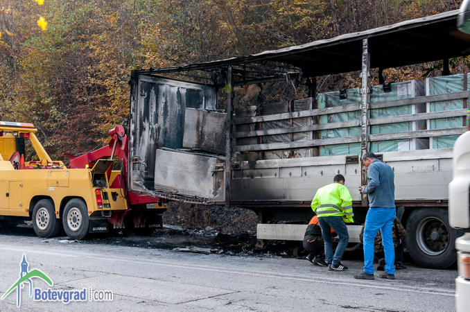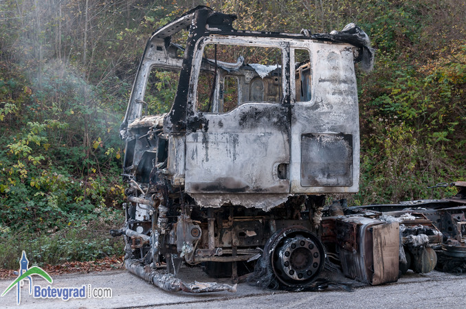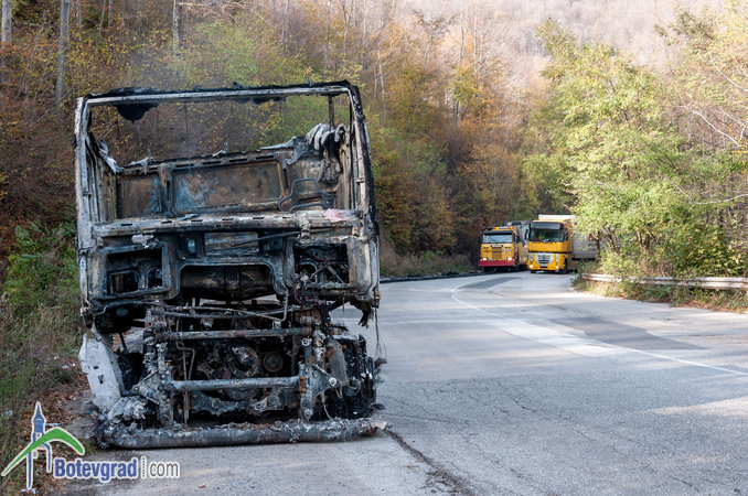 ТИР горя и затрудни движението по стария път от Ботевград за София, през Витиня. Камионът е превозвал гипсокартон от Румъния за София, когато двигателят започва да гори малко преди планинският проход. Шофьорът се е опитал да загаси пламъците с пожарогасители, но напразно – от влекача е останало само желязото. Щетите по ремаркето са по-малки.