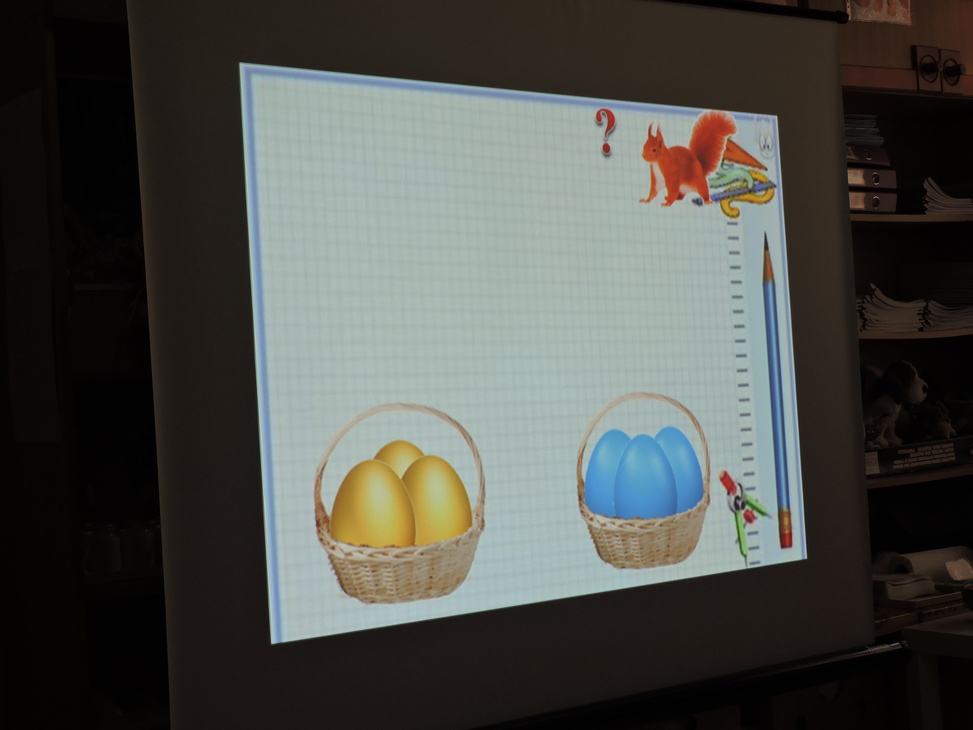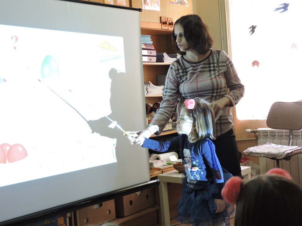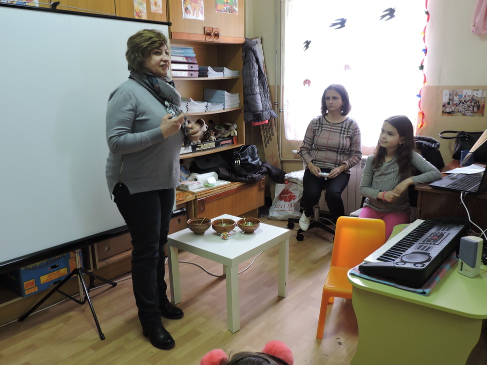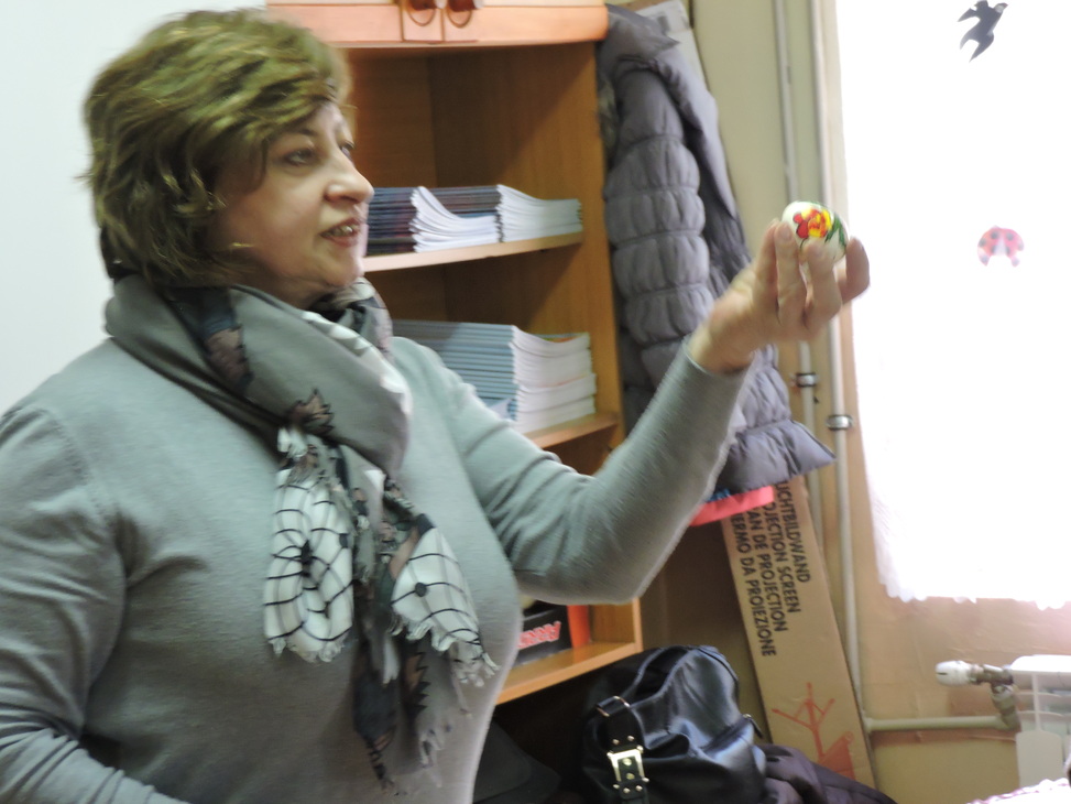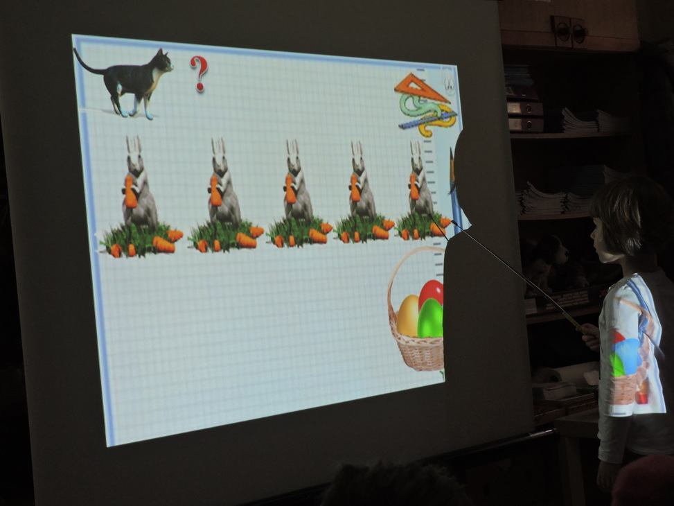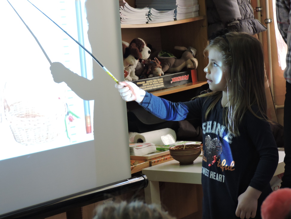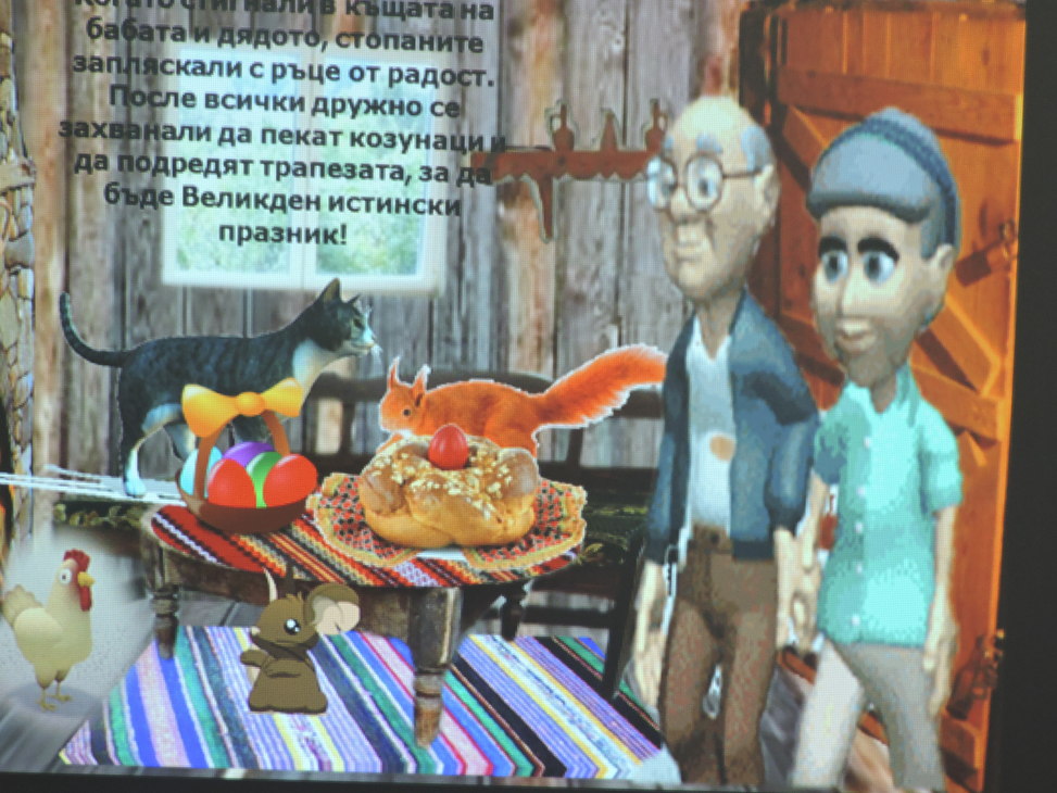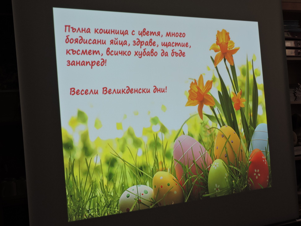 Започнаха с приказката за великденското яйце и неговите приключения, докато стигне до трапезата на дядо и баба. По време на разказа на учителката Юлиана Великова, на екрана „вървеше” презентация. По време на приказката, а и след това й помагаше ученичката от ІІ-а клас в СУ „Христо Ясенов” Анита Стоянова.