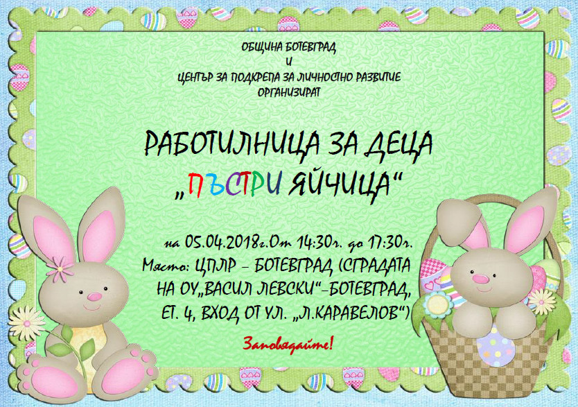 На Велики четвъртък - 5-ти април 2018г., Център за подкрепа за личностно развитие - Ботевград и Община Ботевград организират Работилница за деца „Пъстри яйчица“.