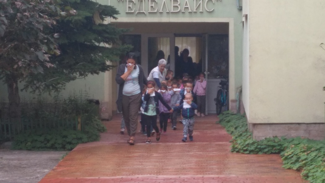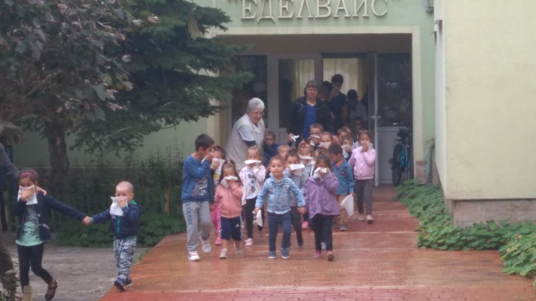 В рамките на "Седмицата на пожарната безопасност" днес, 13.09.2018г. в 10 часа в двора на ДГ "Еделвайс" - гр. Етрополе служители на РСПБЗН - Етрополе проведоха демонстративно пожаротехническо занятие пред любопитните детски очички на малчуганите от детското заведение. След подадения звуков сигнал за опасност от пожар, децата бяха евакуирани в безопасна зона на двора на детската градина от персонала. Те успяха да излязат от сградата за около минута и половина, като в ръцете си държаха мокри кърпи, долепени плътно до устните си за предпазване от вдишване на димните газове.