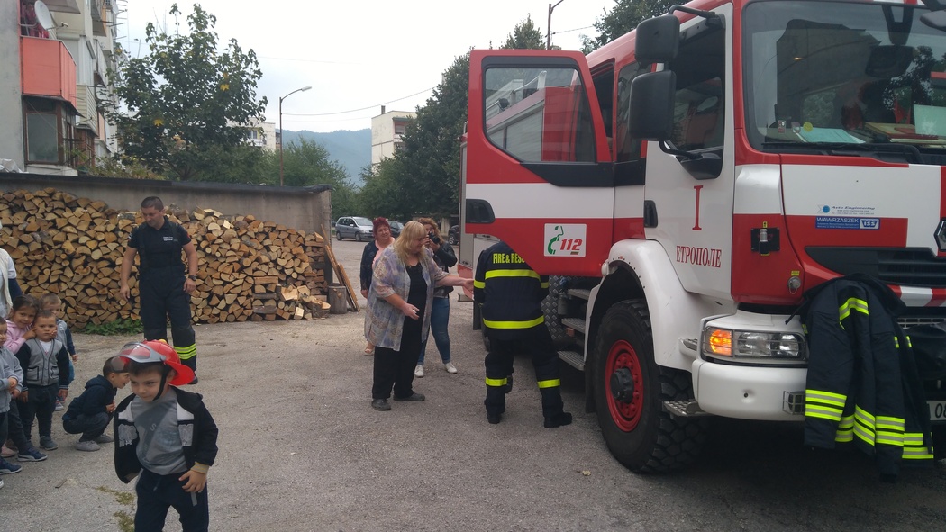 Началникът на противопожарната служба г-н Диков обясни на персонала особеностите на оперативните и евакуационни действия при възникване на произшествия в такъв вид обекти, както и на разбираем детски език запозна децата с особеностите на огнеборската професия, начина на работа, устройството на пожарния автомобил и различното пожаро-техническо въоръжение в автомобила за извършване на пожарогасителни и спасителни дейности.