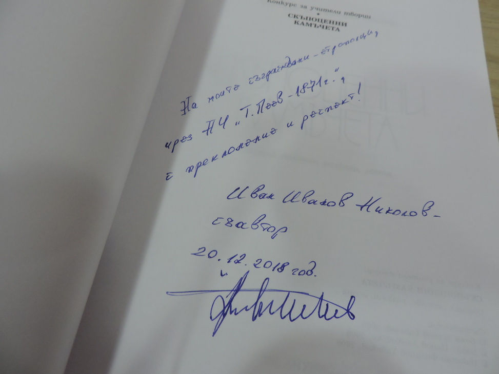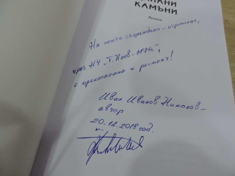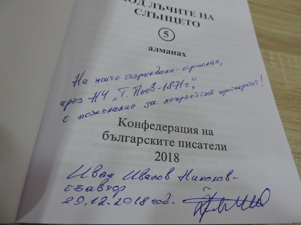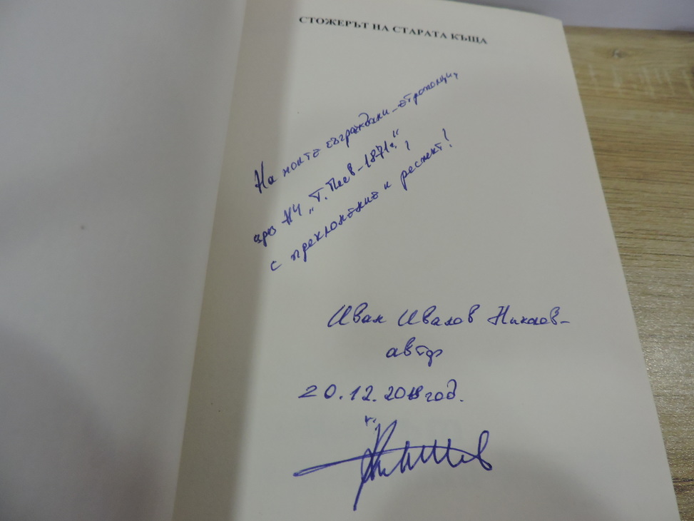 Върху дарените книги той написа посвещението: „На моите съграждани – етрополци, чрез НЧ „Тодор Пеев-1871”, с преклонение и респект”, Иван Иванов /подпис/ и датата 20.12.2108 година.