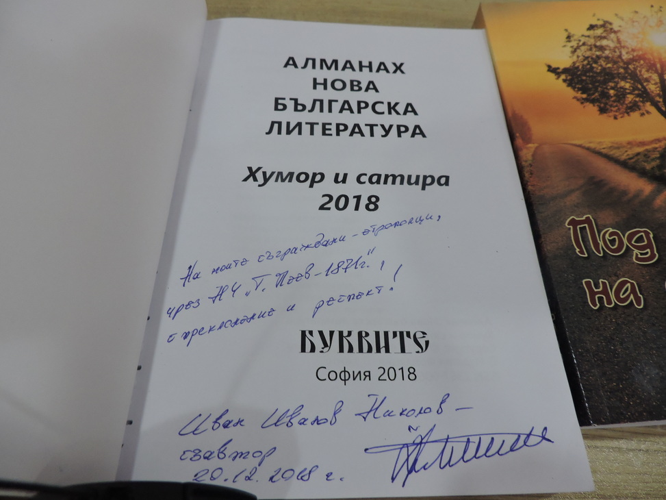 - „Съвременна българска литература Раздел „Хумор и сатира” на Фондация Булвест, с подкрепата на БНР и БНТ, 2018.
