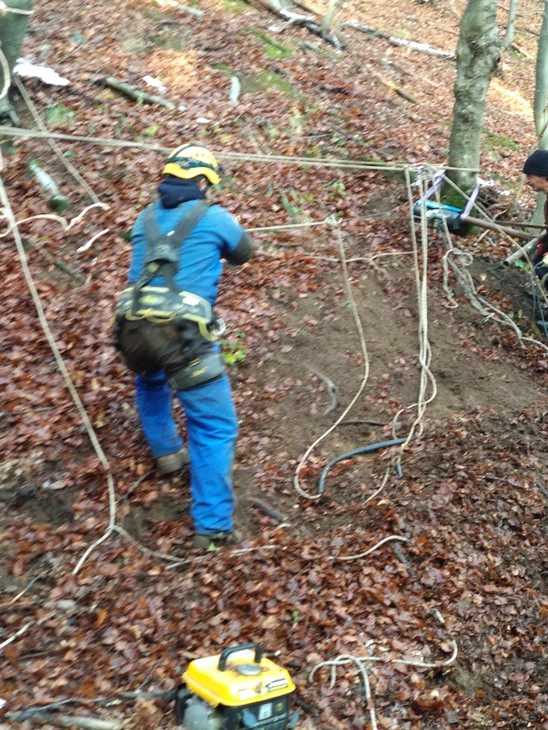 С въжета на място екипирахме „тролей” над пропастта и полиспаст надолу в дълбоката дупка.
