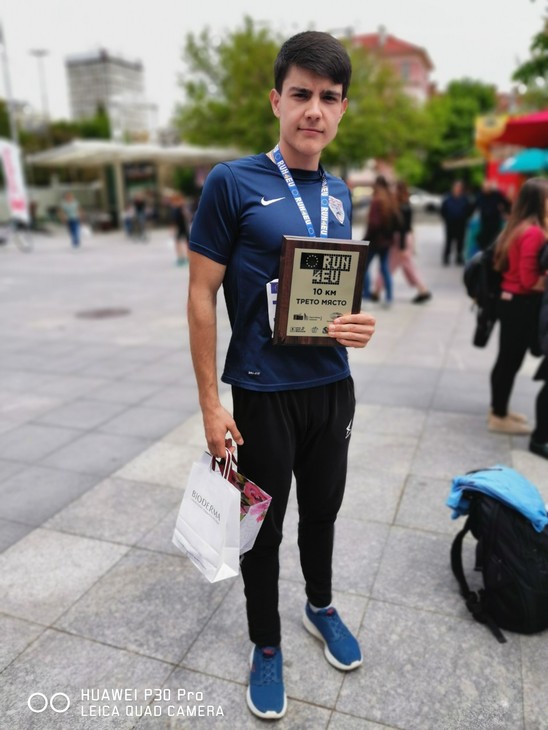 Калоян Крумов, ученик от 12 „б“ клас на ПГТМ „Христо Ботев“, завърши на 3-то място във второто издание на бягането за ученици и училищни отбори - RUN4EU. Надпреварата се проведе днес - 12 май, в София. Калоян Крумов бяга в дисциплината 10 км.
