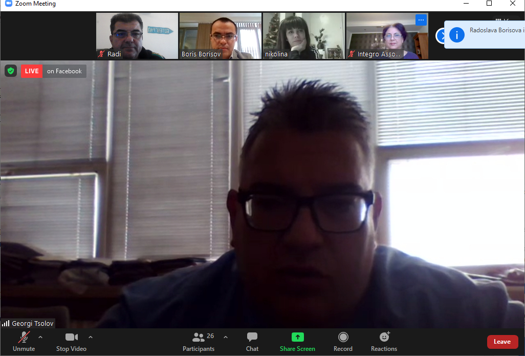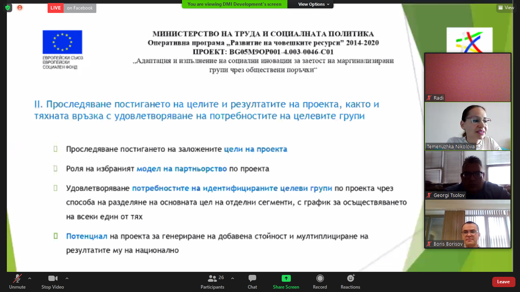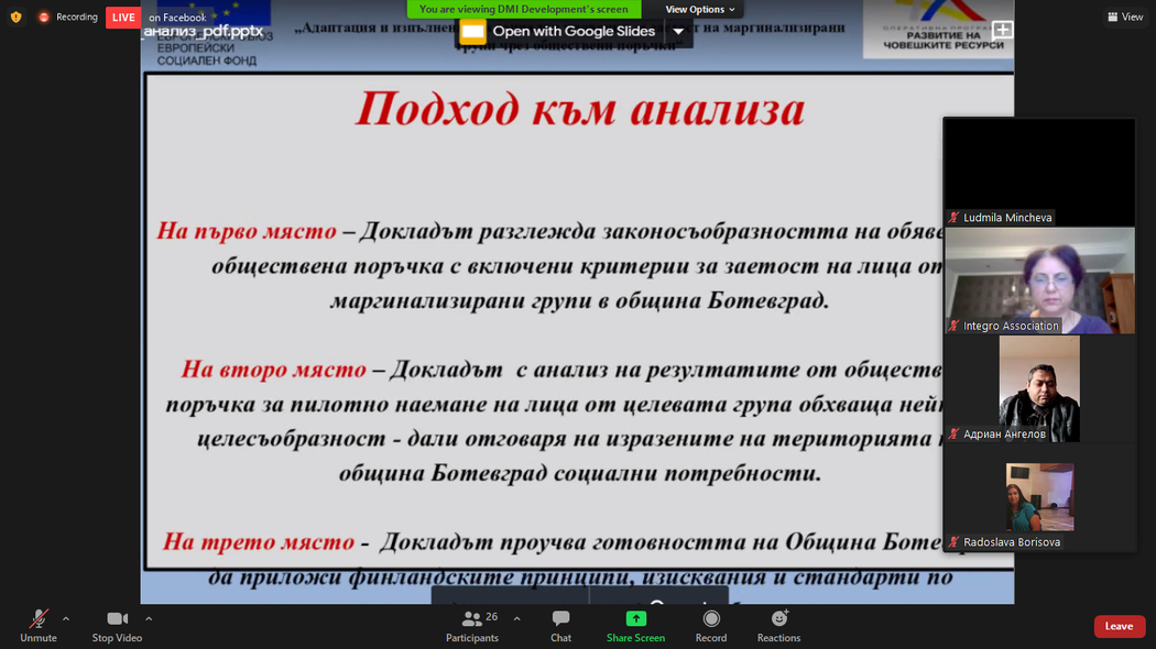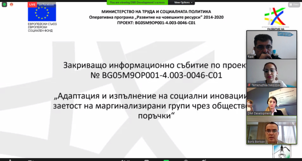 По проект „Адаптация и изпълнение на социални иновации, заетост на маргинализирани групи чрез обществени поръчки“ на Община Ботевград се проведе закриващо информационно събитие в онлайн среда. В него взеха участие 25 човека. Ръководителят на проекта – зам.-кметът Борис Борисов, благодари на всички, които се отзоваха на поканата на Общината. Той представи кратка компютърна разработка за основната идея на проекта, неговата реализация и постигнатите резултати.