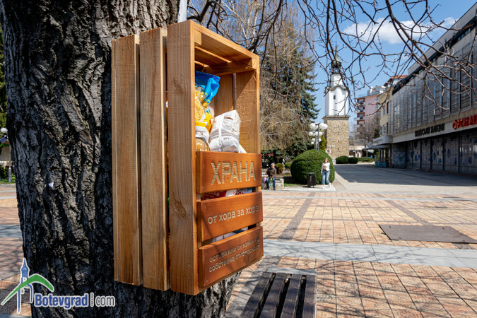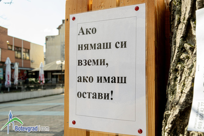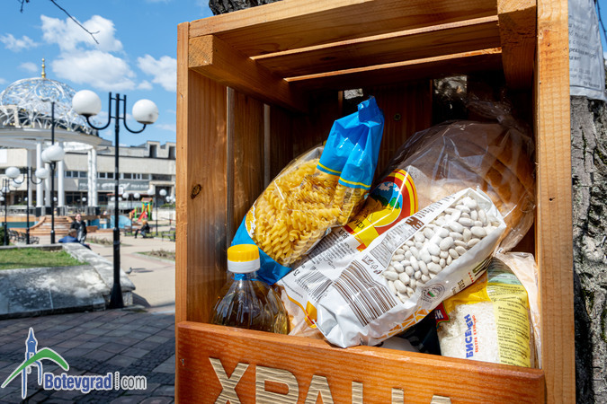 В близост до магазини в Ботевград и селата са поставени дървени щайги с продукти от първа необходимост. Те са предназначени за хора в затруднено положение. „Ако нямаш си вземи, ако имаш – остави!“, гласи призивът на инициаторите – общинската организация на ПП ГЕРБ, които поясняват, чрез друг надпис, че това може да направи всеки на собствена отговорност. За да няма злоупотреби и прояви на вандализъм, дървените щайги с продуктите попадат в обсега на камерите за видеонаблюдение.