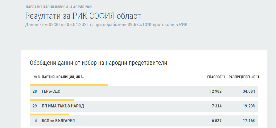 ГЕРБ–СДС – 34,08% /12 982 гласа/, Има такъв народ – 19,20% /7 314 гласа/, БСП – 17,16% /6 537 гласа/.Това сочат междинните резултати на ЦИК при обработени 39.68% протоколи на СИК в Районната избирателна комисия.