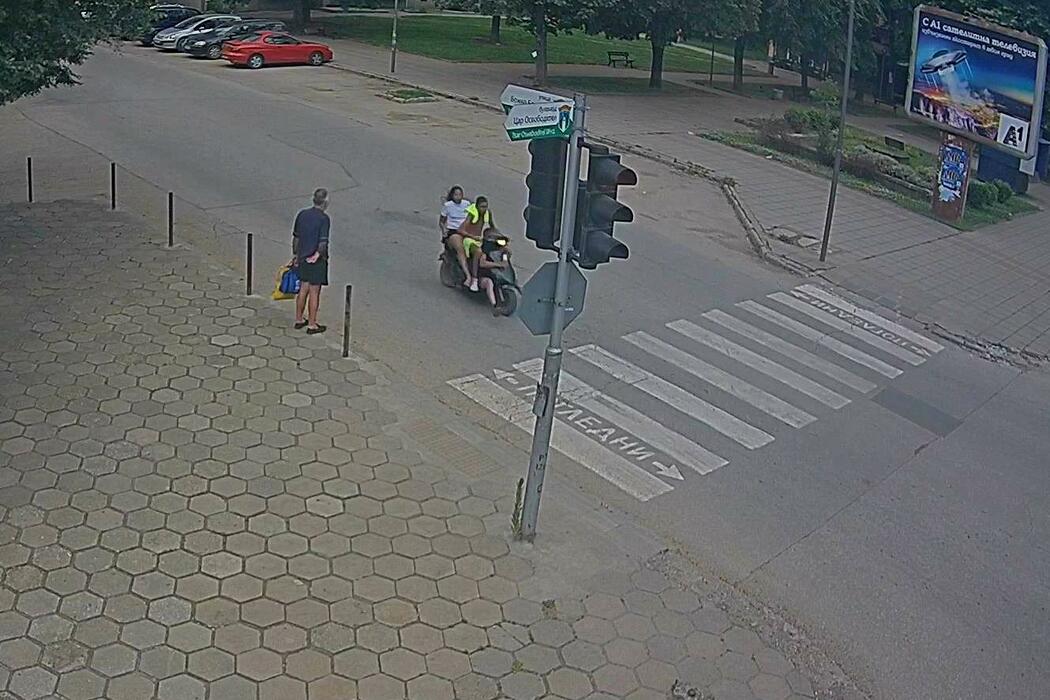 Три деца, качени на скутер, минават на червен светофар на оживено кръстовище в Ботевград. Като по чудо не предизвикват пътно произшествие. Кадрите са заснети от камерите за видеонаблюдение. Отдел "Обществен ред и сигурност" ги разпространи, защото подобни действия застрашават живота на децата, но и на всички участници в движението.