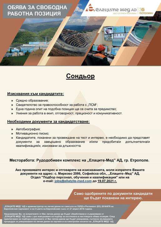 Ако проявявате интерес и отговаряте на изискванията, моля изпратете Вашите документи на адрес: с. Мирково 2086, Софийска обл., „Елаците-Мед" АД, Отдел "Подбор персонал, обучения и квалификация" или на e-mail: iobs(6)ellatzite-med.com до 19.07.2021 г.