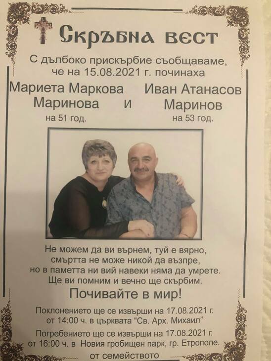 Днес погребват загиналите в катастрофата на 15 август т.г., Мариета Маркова Маринова – на 51 година и съпругът й Иван Атанасов Маринов – на 53 години.