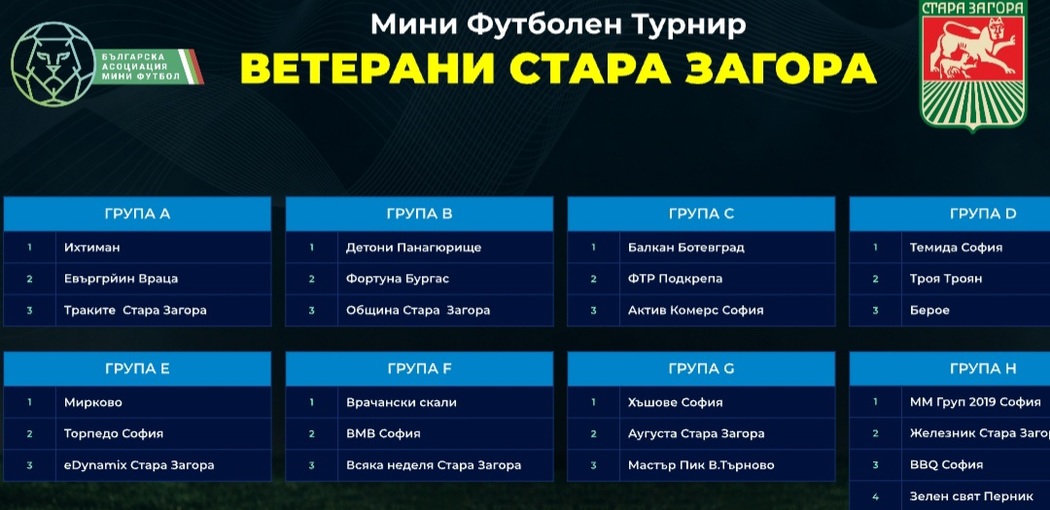 Днес футболният отбор на ветераните на Балкан започна участието си в голям турнир по минифутбол в Стара Загора. В него са се записали за участие 24 отбора, разделени в 8 предварителни групи по 3 тима.