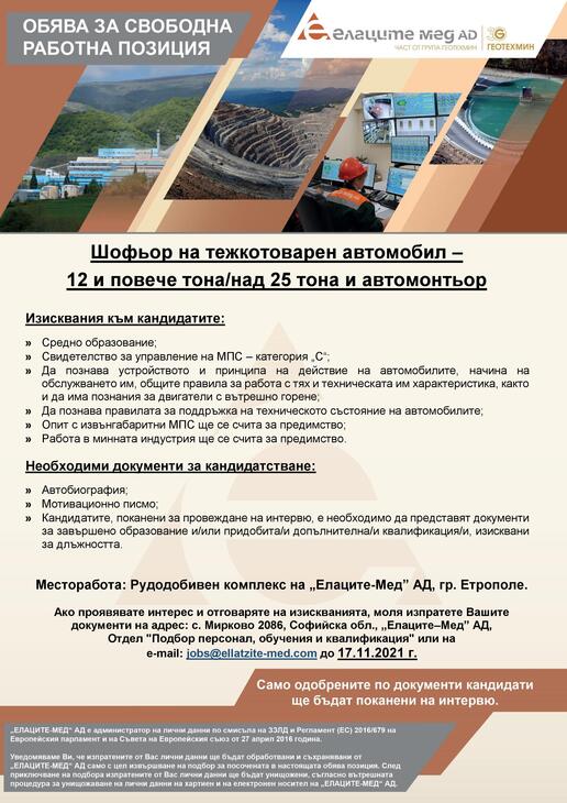 Ако проявявате интерес и отговаряте на изискванията, моля изпратете Вашите документи на адрес: с. Мирково 2086, Софийска обл., „Елаците-Мед" АД, Отдел "Подбор персонал, обучения и квалификация" или на e-mail: jobs@ellatzite-med.com до 17.11.2021 г.