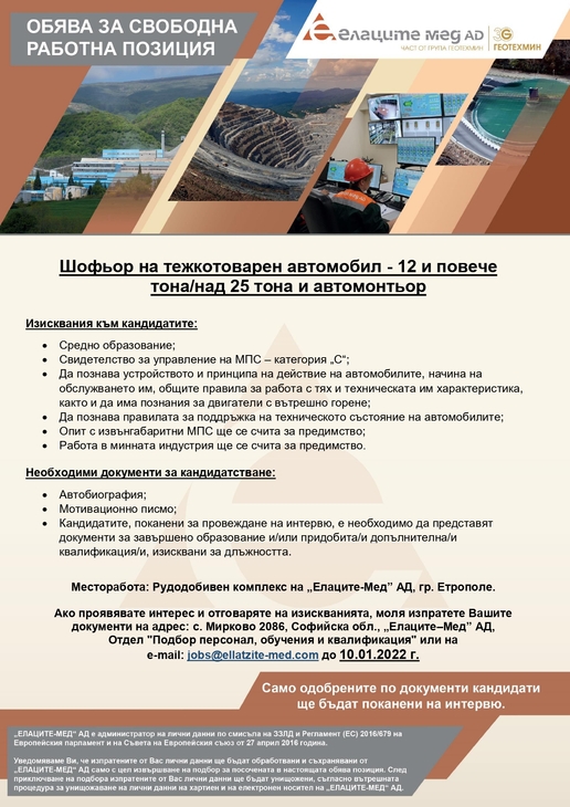 Ако проявявате интерес и отговаряте на изискванията, моля изпратете Вашите документи на адрес: с. Мирково 2086, Софийска обл., „Елаците-Мед" АД, Отдел "Подбор персонал, обучения и квалификация" или на e-mail: jobs@ellatzite-med.com до 10.01.2022 Г.