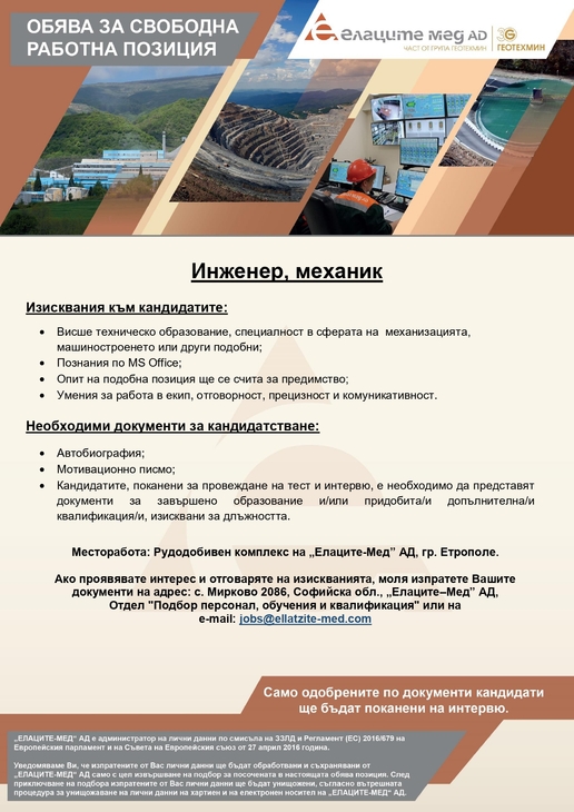 Ако проявявате интерес и отговаряте на изискванията, моля изпратете Вашите документи на адрес: с. Мирково 2086, Софийска обл., „Елаците-Мед" АД, Отдел "Подбор персонал, обучения и квалификация" или на e-mail: jobs@ellatzite-med.com