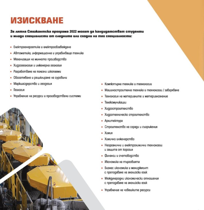 В нашата лятна Стажантска програма можеш да придобиеш ценен опит в реална работна среда на двете ни производствени площадки – Рудодобивен и Обогатителен комплекс. Тук ще имаш възможност да се запознаеш с дейността на компанията по цехове и отдели и с най-добрите практики, познати в нашия бранш.