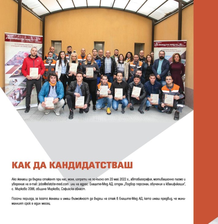 Ако желаеш да бъде стажант при нас, моля, изпрати не по-късно от 6 юни 2022 г., автобиография, мотивационно писмо и уверение на е-mail: jobs@ellatzite-med.com или на адрес: Елаците-Мед АД, отдел „Подбор персонал, обучения и квалификация“, с. Мирково 2086, община Мирково, Софийска област.