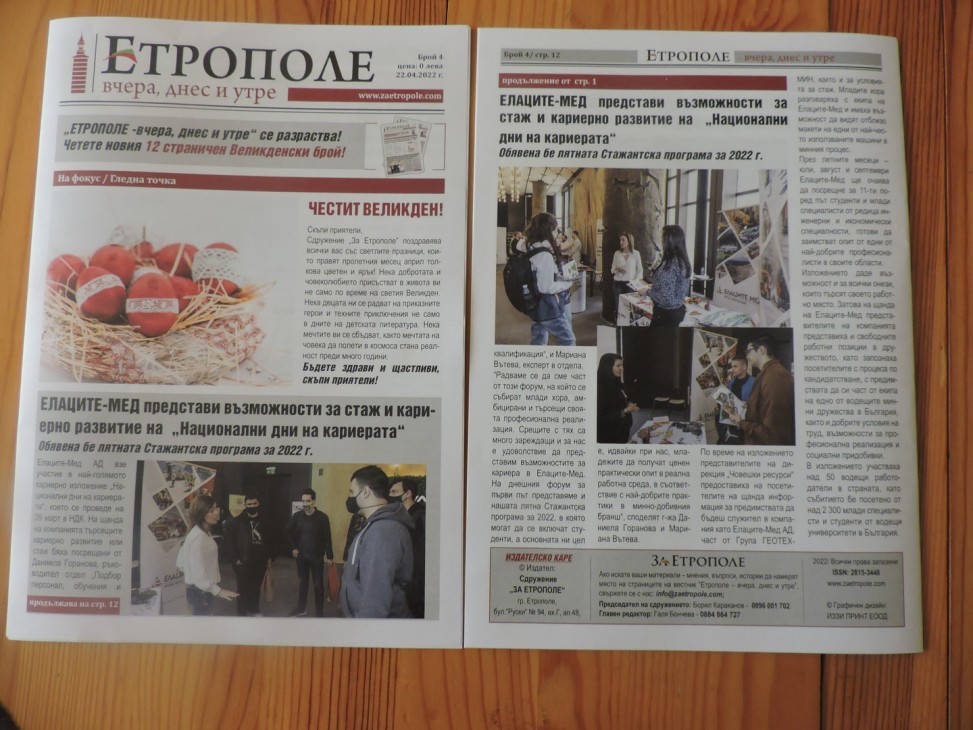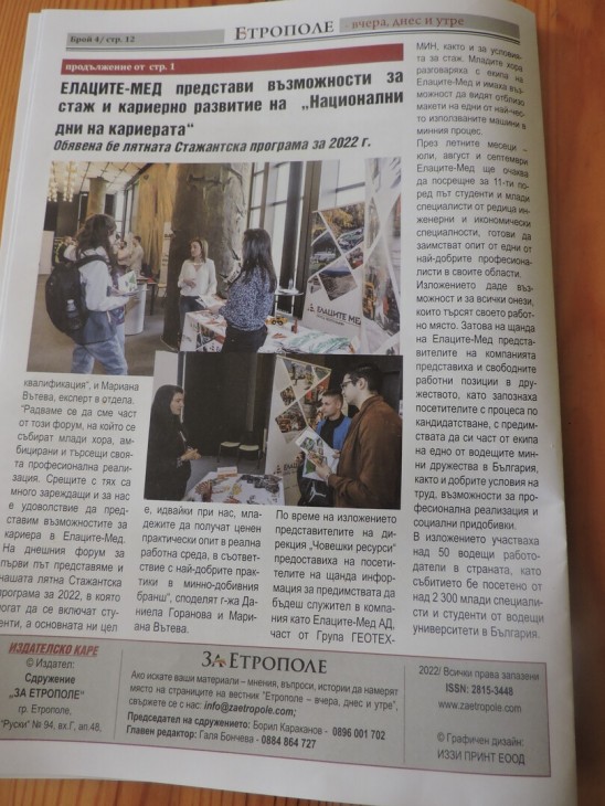 - Елаците-Мед представи възможности за стаж и кариерно развитие на „Национални дни на кариерата” . Обявена бе лятната стажантска програма за 2022 година.