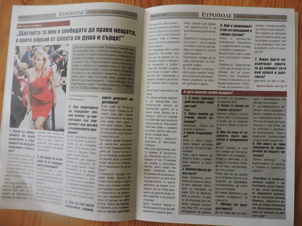 - Интервюто на броя: Стела Бобчева – психотерапевт, юрист, търговски директор в „Хармони Груп” ЕООД. / С продължение на 8 страница/.
