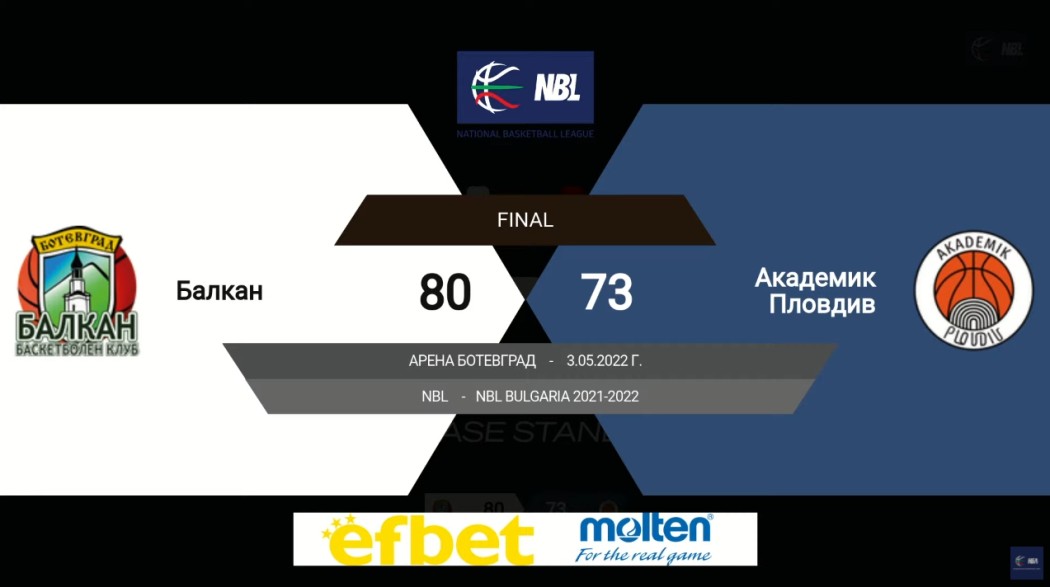 Баскетболистите на Балкан спечелиха първата среща от четвъртфиналния плейоф срещу Академик Пловдив с 80-73 (23-15, 22-19, 14-17, 21-22). Вторият мач от серията, която се играе до две победи, е на 6 май от 19.00 ч. в комплекс Сила в Пловдив.