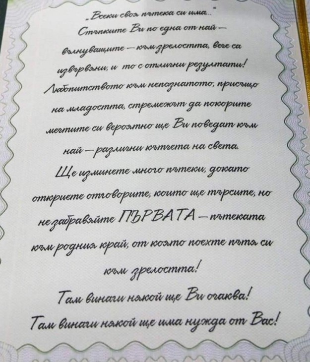 В обръщението си към отличниците, секретарят на Общината заяви: “Скъпи млади хора, на Вас искам да пожелая здраве, да Ви поздравя, за това че сте направили най-важния избор на този етап от живота си, а именно да поемете отговорно бъдещето в свои ръце чрез постигане на високи образователни резултати! Бъдете себе си и продължавайте да следвате мечтите си!“. Стефка Граматикова отправи към тях и посланието, написано в почетните грамоти.