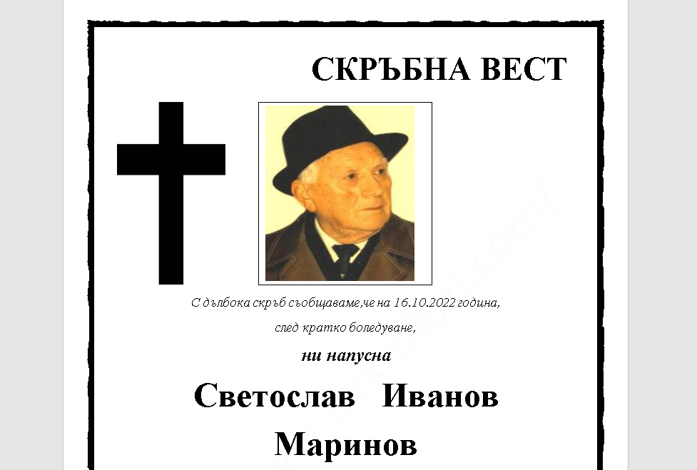 Преклонението ще се състои на 18 октомври 2022 г. от 12:00 часа в дома на покойния.