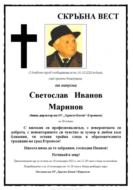 На 28 май 2022 година господин Светослав Иванов Маринов навърши 88години. На 16 октомври, 2022 година, след кратко боледуване, винаги усмихнатият, позитивният наш учител, вещият директор, преданият колега и приятел, се пресели в друг свят. В сърцата ни завинаги ще остане място за този така добър човек, дал своя принос за развитието на образованието и културата в Етрополе!