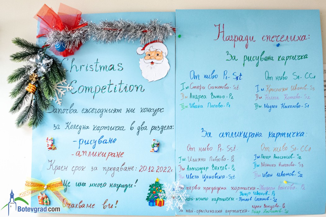 Тазгодишното състезание за изработване на коледни и новогодишни картички, организирано от училище „Европа“, се провежда с благотворителна цел. Възпитаниците на учебното заведение изработиха над 100 поздравителни картички за Коледа и Нова година. Класирането се извърши в две възрастови групи - от 2-ри до 4-ти клас и от 5-ти до 10-ти клас, и в две категории – „Рисувана картичка“ и „Апликирана картичка“.