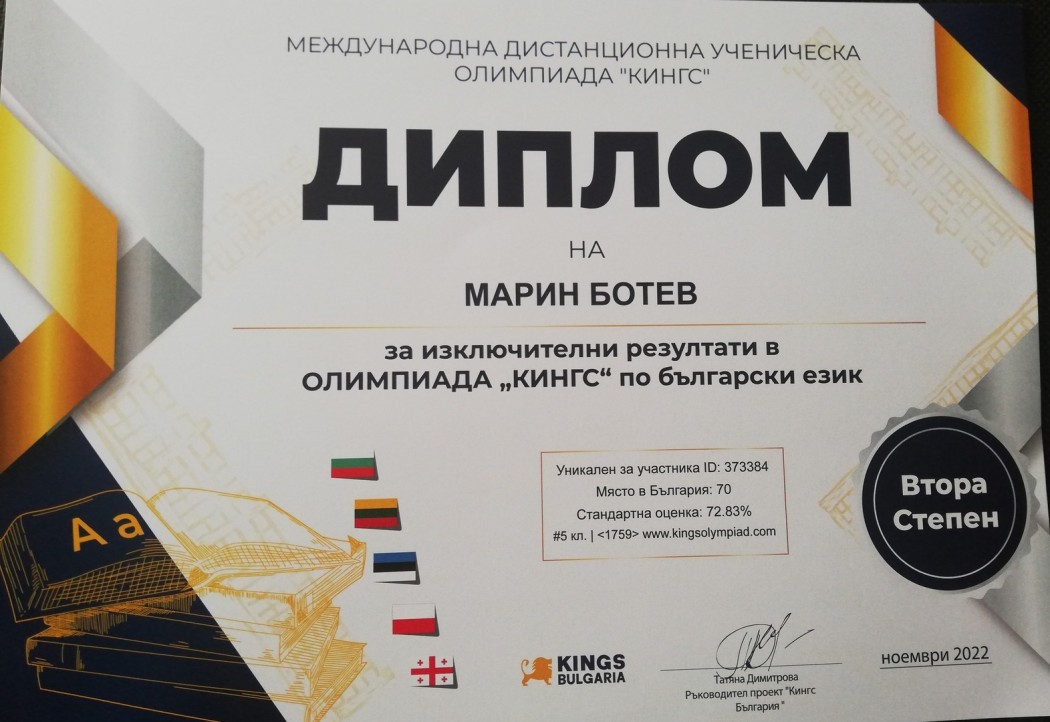 Ученикът от 5-ти клас Марин Ботев спечели Диплом- 2-ра степен на Международната дистанционна олимпиада "КИНГС" , участвайки във финалния кръг по предметите Човекът и природата, Математика и Български език и литература.