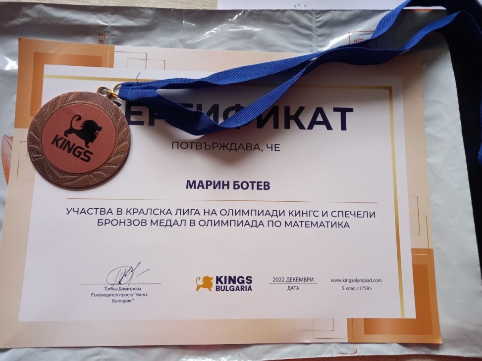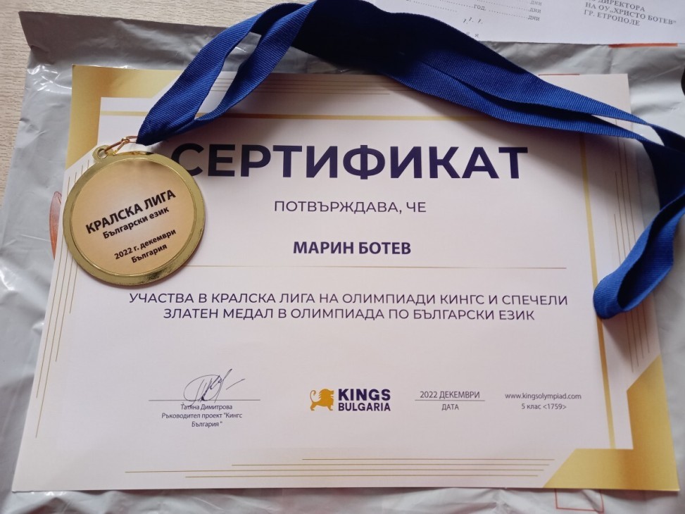 Ученикът Марин Ботев от ОУ ,,Христо Ботев" - гр. Етрополе участва в Кралската лига на Олимпиада Кинг и спечели бронзов медал по математика и златен медал по български език.