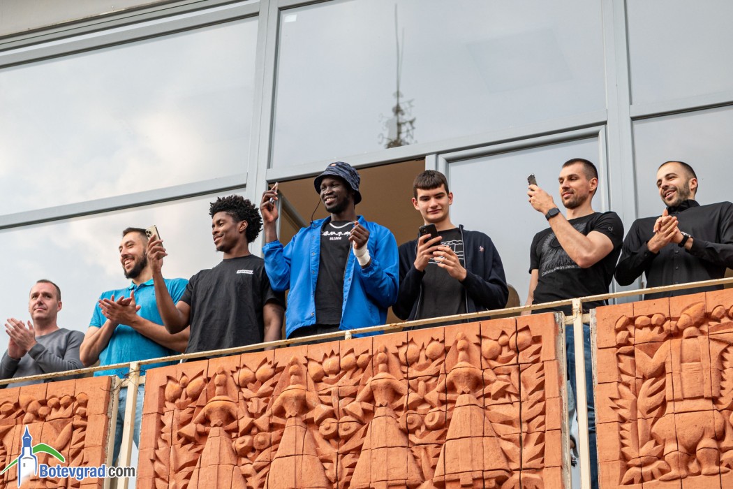 Шампионите се качиха на терасата на читалището под мощните възгласи на множеството под тях , и бяха поздравени с традиционните скандирания, които се чуват и по време на мачовете на отбора - независимо дали в Арена Ботевград или в зала извън Ботевград.