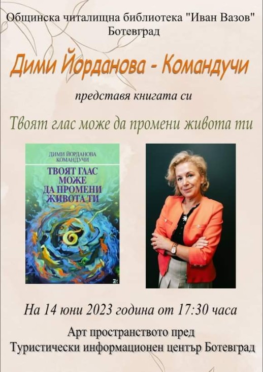 На 14 юни /сряда / в арт пространството пред Туристически информационен център – Ботевград ще бъде представена втората книга на Дими Йорданова - Командучи „Твоят глас може да промени живота ти”.