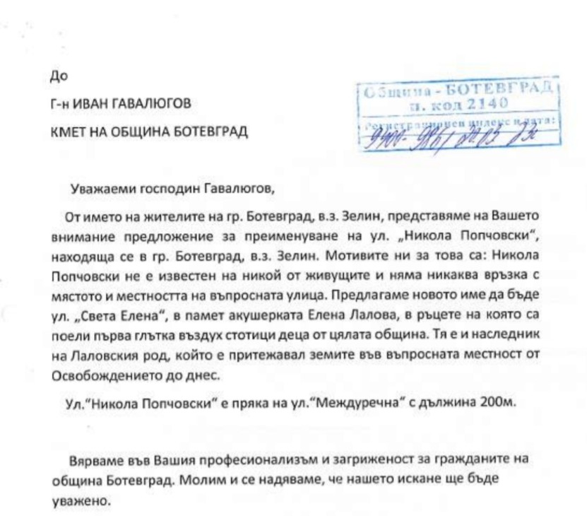 Жители на Ботевград и собственици на имоти в Зелин предлагат улица “Никола Попчовски“ във вилната зона да бъде преименувана на “Света Елена“, в памет на акушерката Елена Лалова. Мотивите им за това за следните: “Никола Попчовски“ не е известен на никой от живущите и няма връзка с мястото и местността на въпросната улица. Предлагаме новото име да бъде “Света Елена“ в памет на акушерката Елена Лалова, в ръцете на която са поели първа глътка въздух стотици деца от цялата община. Тя е наследник на Лаловския род, който е притежавал земите във въпросната местност от Освобождението до днес.“.
