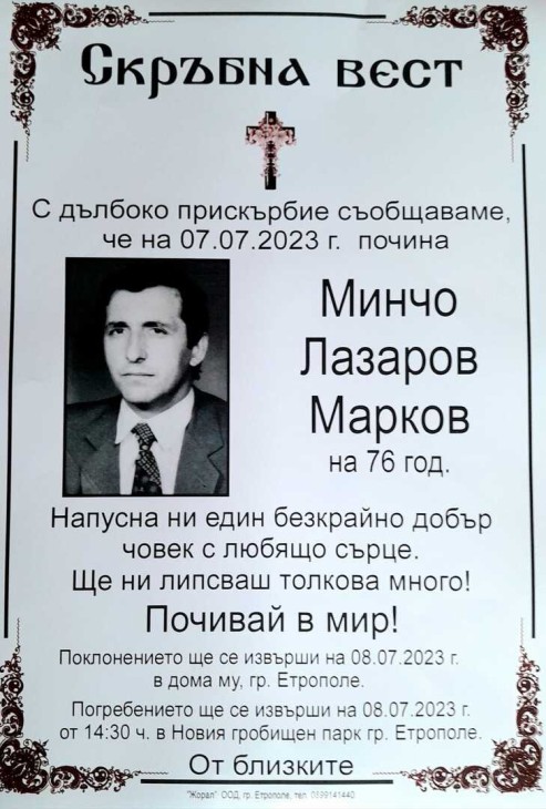 Много спомени ще нося в сърцето си от нашето детство, когато роднините бяха най -близките хора! Ще те помня със закачливата ти усмивка ,скромността , добрината и златните ти ръце с които на всеки си помагнал!