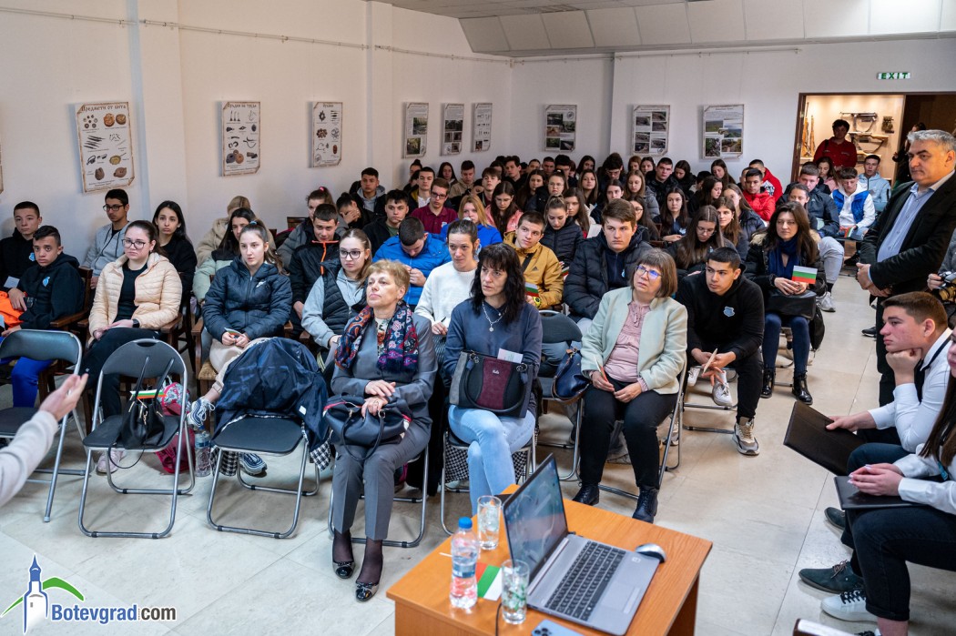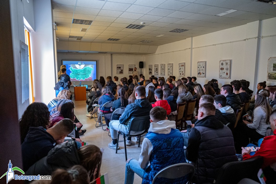 В месеца на националния празник на България, в годината, в която нашият град чества 90 години с името на Ботев и в навечерието на 158-та годишнина от градското начало и 158 години от построяване на Часовниковата кула в Ботевград учениците от десетите класове и от дванадесети клас с профил „История“ се срещнаха с основателите на Сдружение „Българска история“ Марио Мишев и Иван Кънчев в един различен „Урок по родолюбие“. Поканата към тях отправи старши учителят по история и цивилизации и география и икономика г-н Николай Пеев, воден от идеята историята да се представи не просто като наука, съдържаща се на страниците на учебника, а да оживее пред очите и в сърцата на младите хора. Любезен домакин на събитието бе Исторически музей Ботевград.