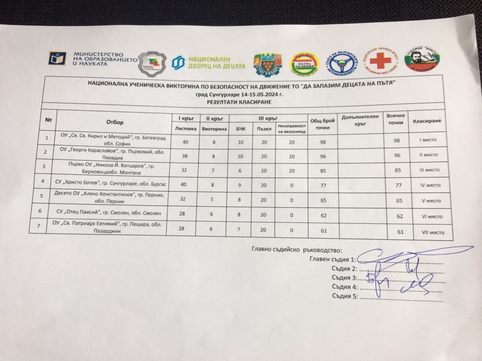 Отборът на ОУ „Св. Св. Кирил и Методий“ - вицешампион в Националната викторина „Да запазим децата на пътя“