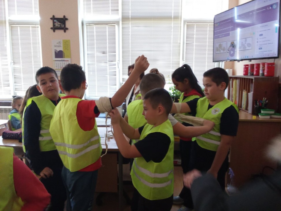 Медицинският фелдшер на учебното заведение Галя Пешева разясни на доброволците честите причини, в резултат на които се стига до кръвотечение. Посредством предварително подготвени превързочни материали тя им демонстрира как се прави тампон за кръвоспиране и превръзка на скъсани кръвоносни съдове. За да затвърдят придобитите знания, учениците се разделиха по двойки и упражниха на практика направата на превръзка.