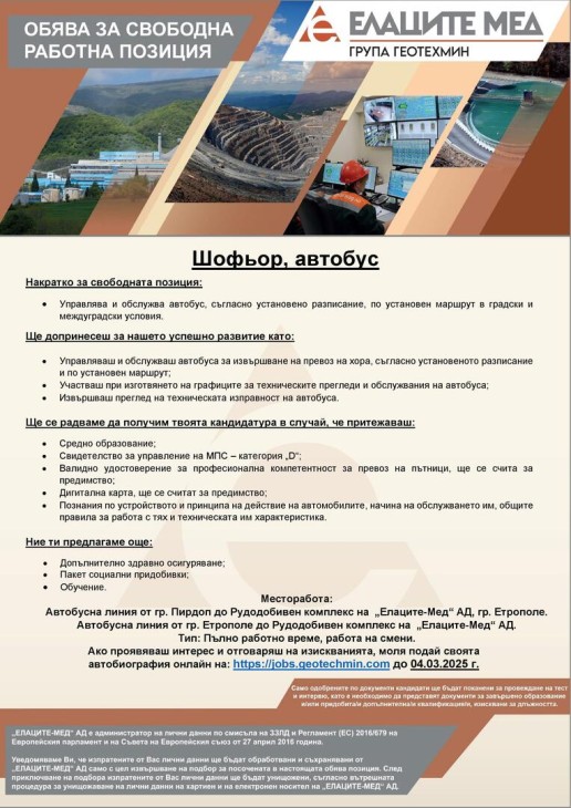 Елаците-Мед обявява две свободни работни позиции за "Инспектор, противопожарна охрана" и "Шофьор, автобус".