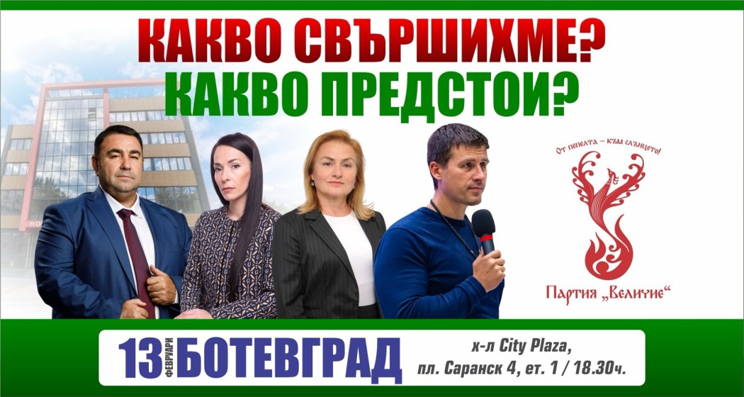 ПП „Величие“ и Ивелин Михайлов провеждат отворени срещи в цялата страна. Поредната такава среща е организирана в Ботевград. Тя ще се състои на 13 февруари /четвъртък/ от 18:30 часа в хотел „Сити плаза“ /ет. 1, голямата зала към ресторанта/, който се намира на площад „Сарaнск“ 4.