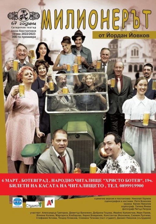 Постановката „Милионерът” от Йордан Йовков ще бъде играна в Ботевград на 6 март от 19 часа в големия салон на читалището. В главните роли са Силвия Лулчева, Димитър Баненкин, Контантин Икономов, Ивайло Калоянчев, Теодор Елмазов, Стефания Колева, Елена Атанасова и др.