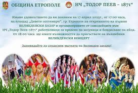 Община Етрополе и НЧ "Тодор Пеев - 1871" имат удоволствието да Ви поканят на откриването на първия Великденски базар и органзираните от самодейците работилници за козунаци и боядисани яйца в Етрополе. Събитието ще се състои на 17 април 2025г., от 17:00 часа, на площад „Девети септември“.