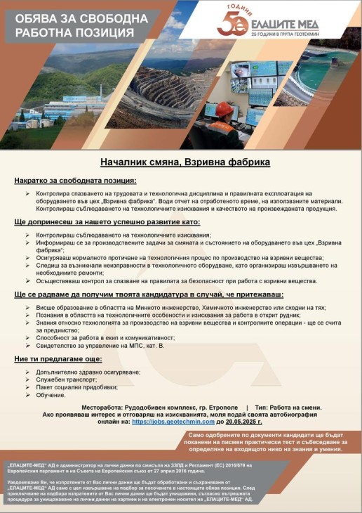 Месторабота: Рудодобивен комплекс, гр. Етрополе | Тип: Работа на смени. Ако проявяваш интерес и отговаряш на изискванията, моля подай своята автобиография онлайн на: пНрз://|оЬз.део1еспггнп.сот до 20.05.2025 г.