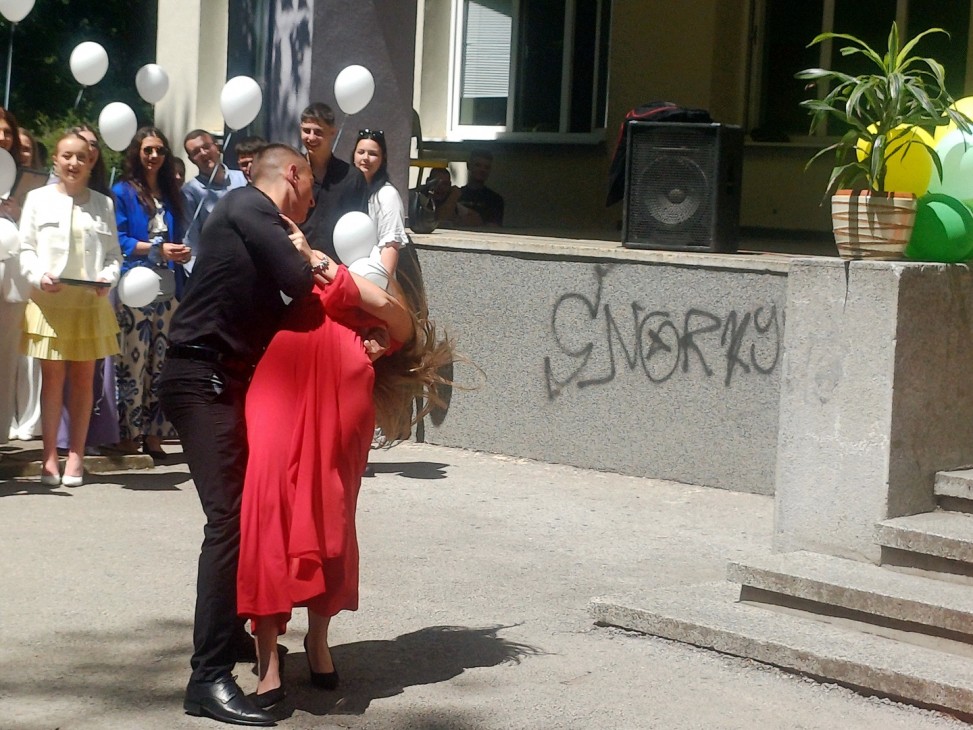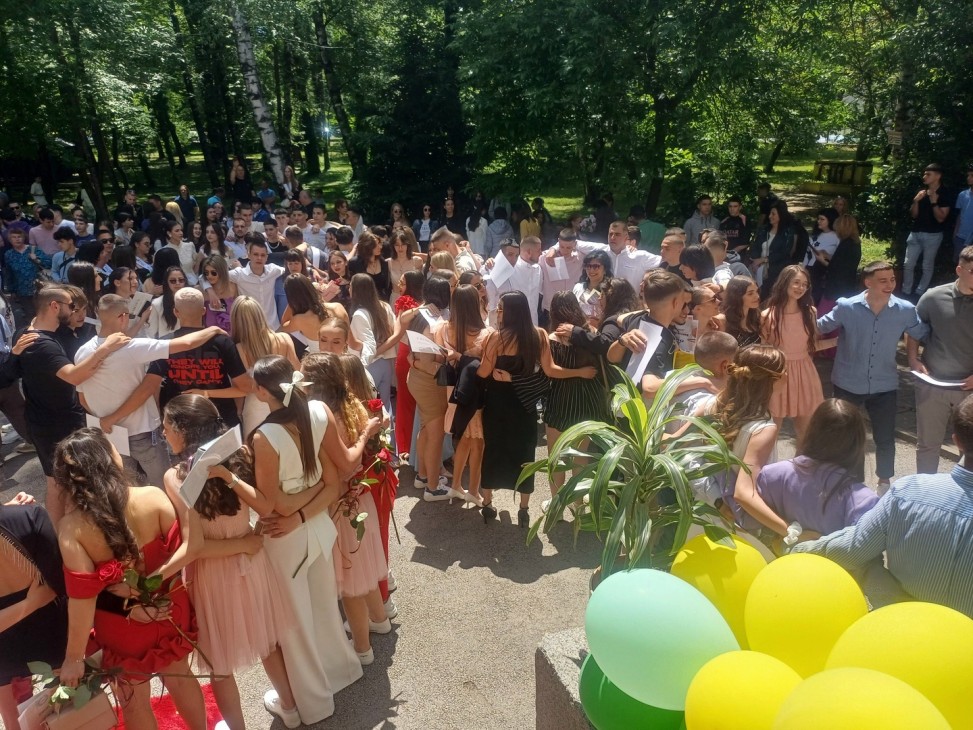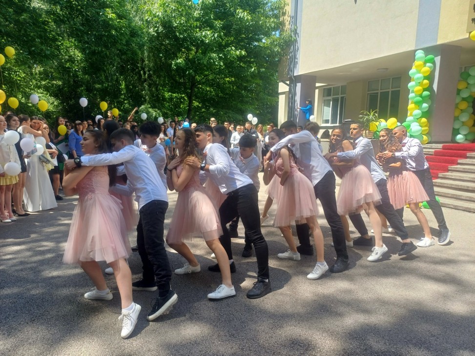Първия поздрав към абитуриентите отправиха деветокласниците, които заедно изпълниха песента на Орлин Павлов - “Още малко и ще бъдем добре… Още малко и ще бъда до теб…“.